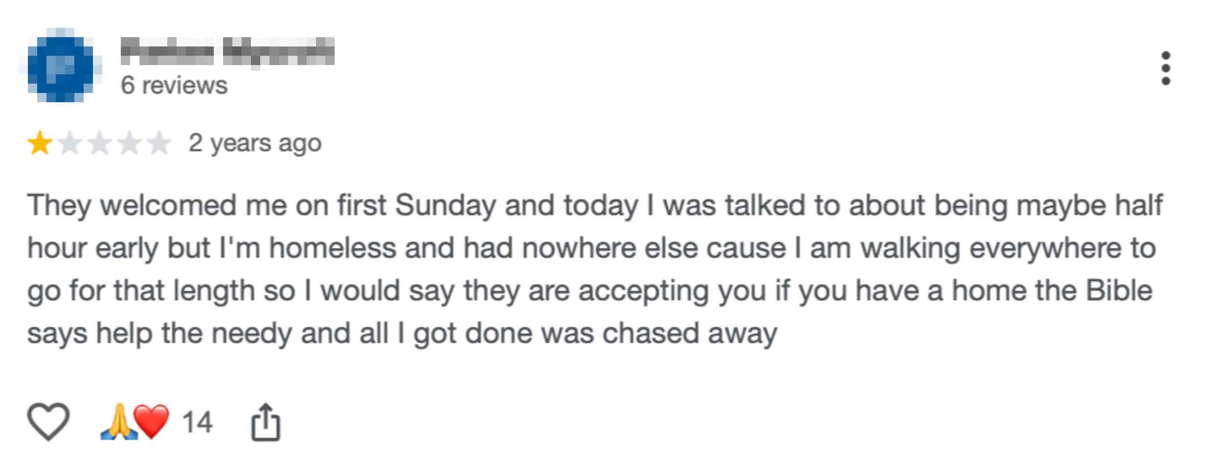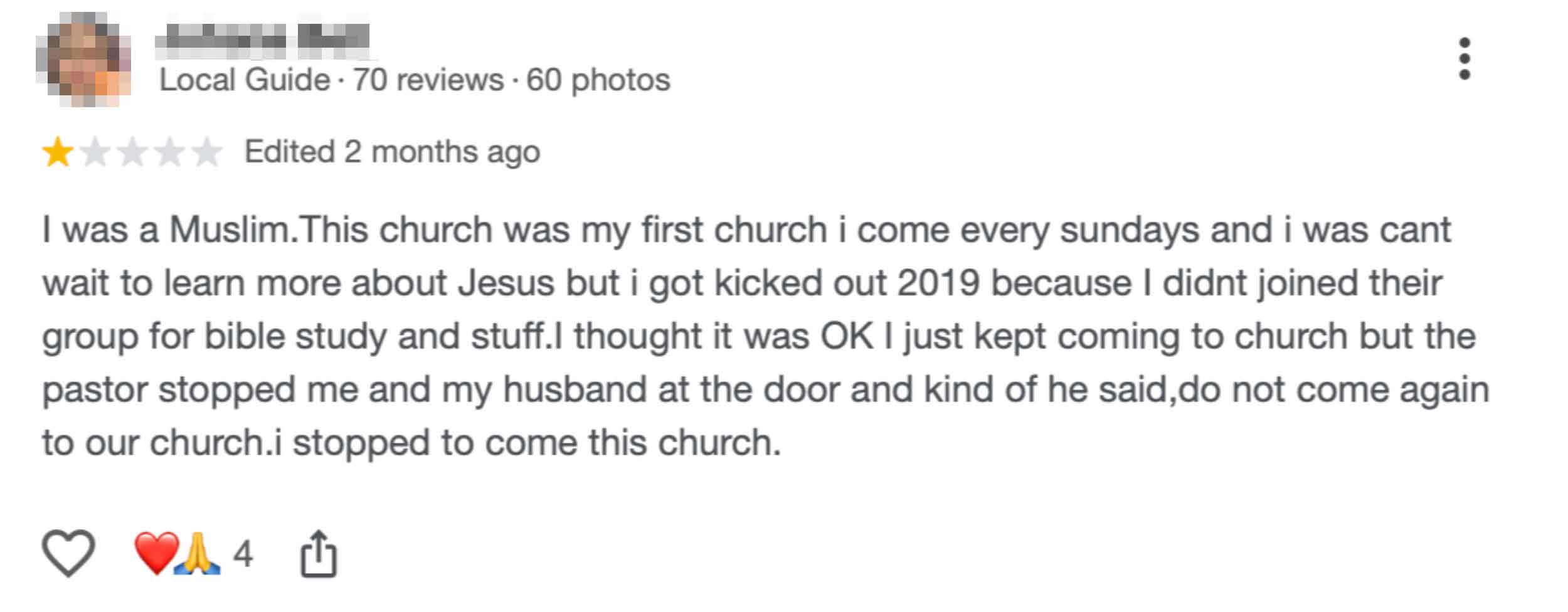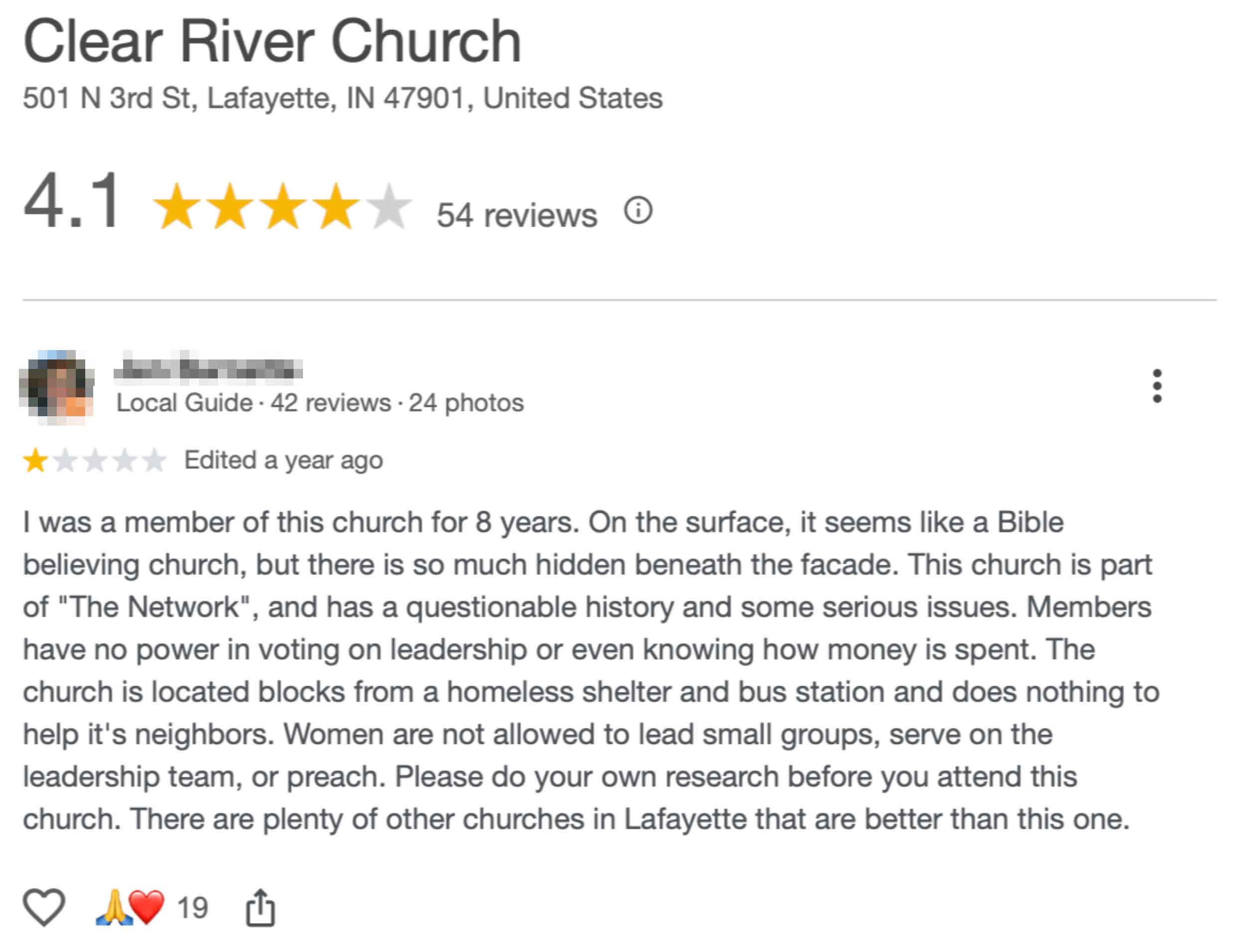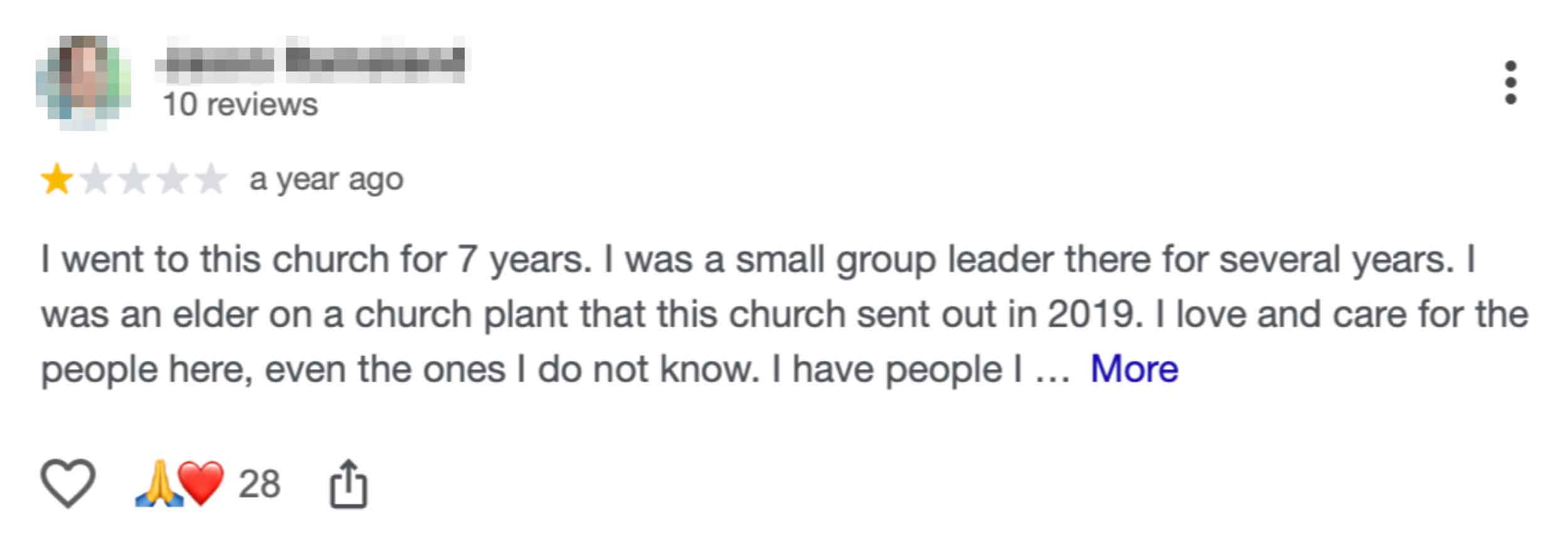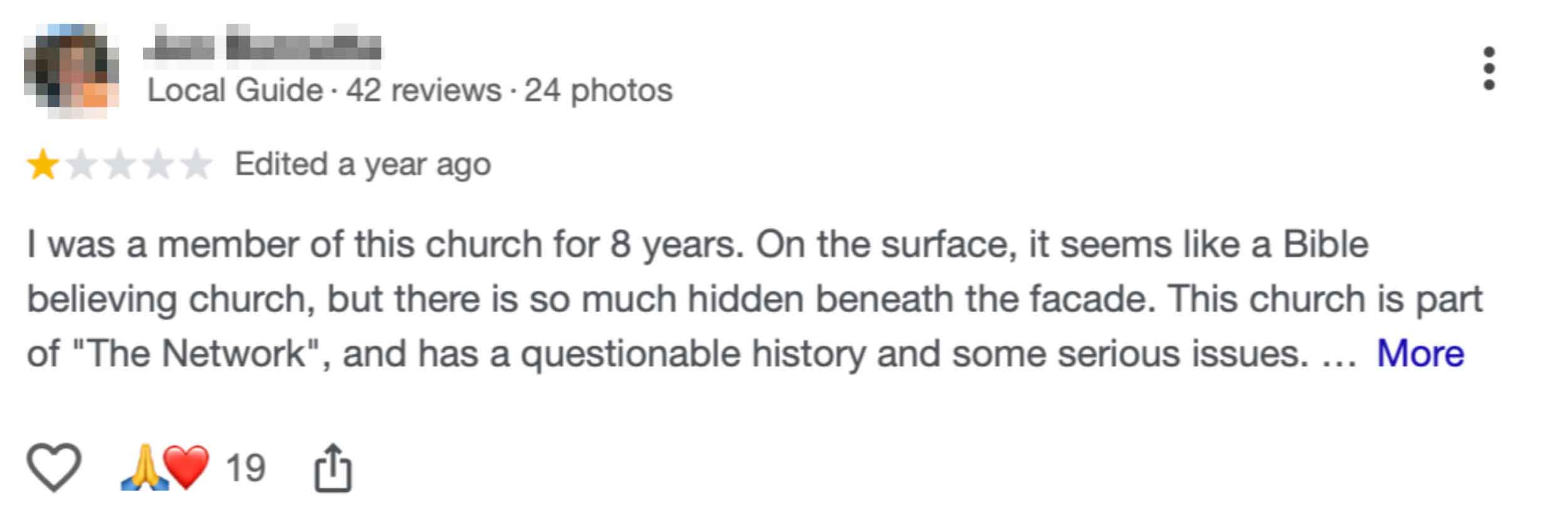 NOTE: We are not surfacing all negative reviews which have been posted to crowdsourced review sites. Rather, we have selected entries which bear witness to a pattern of the behaviors outlined in our article "8 Signs of a Dysfunctional Church".