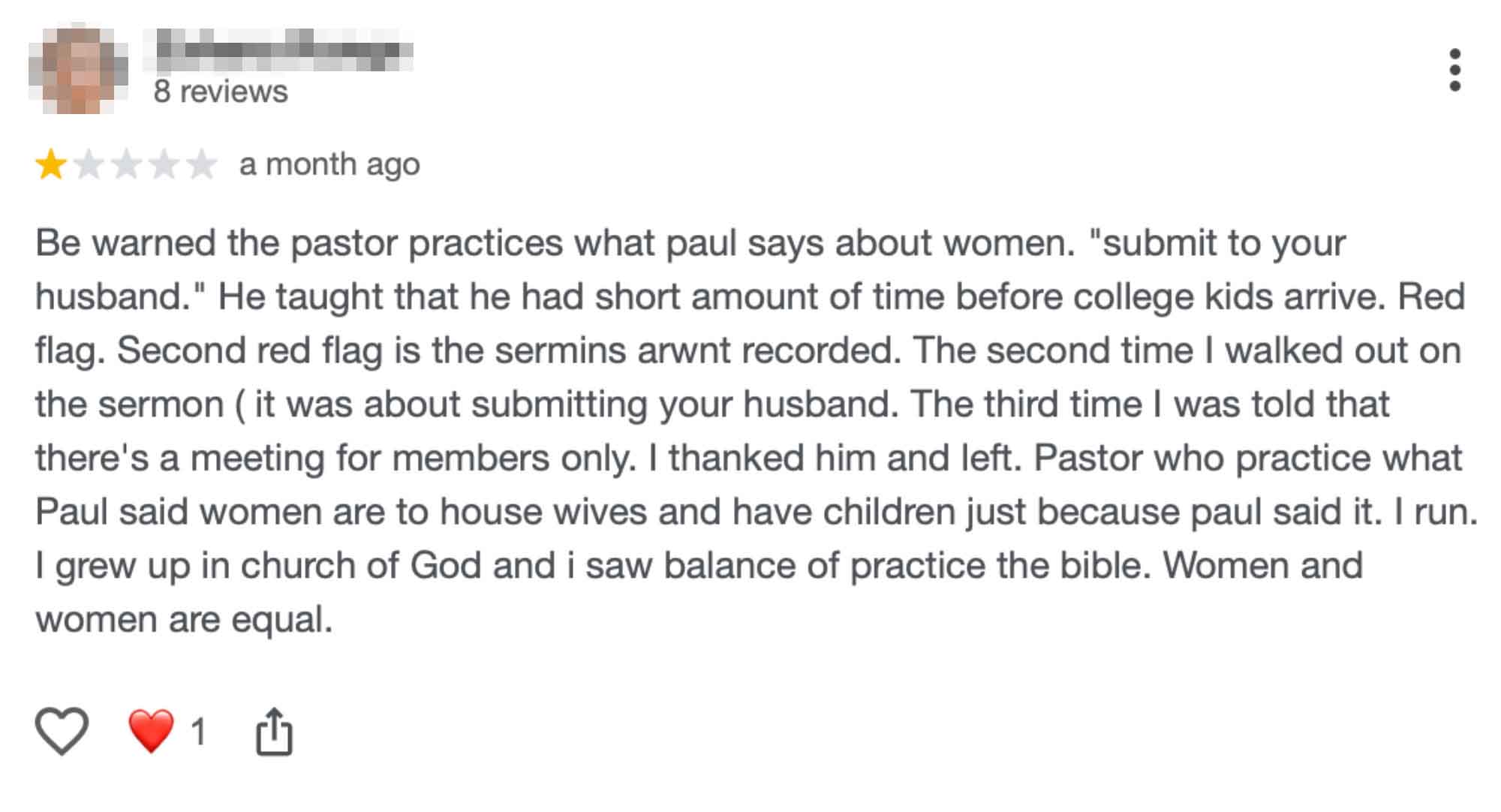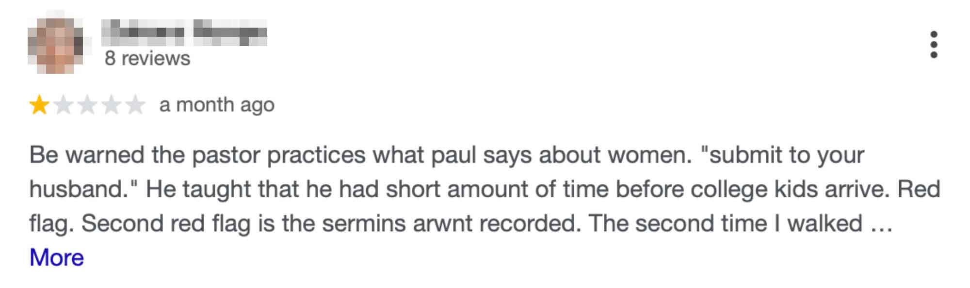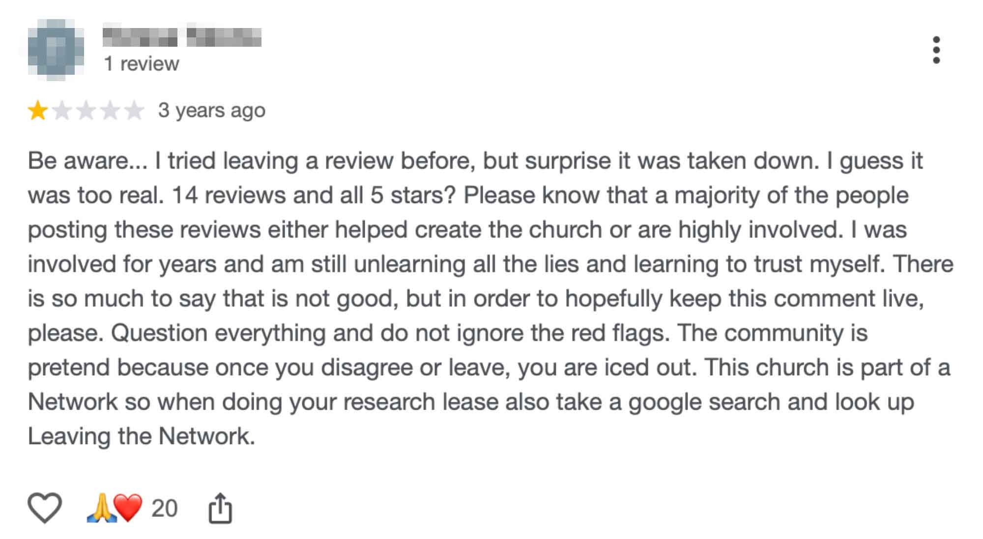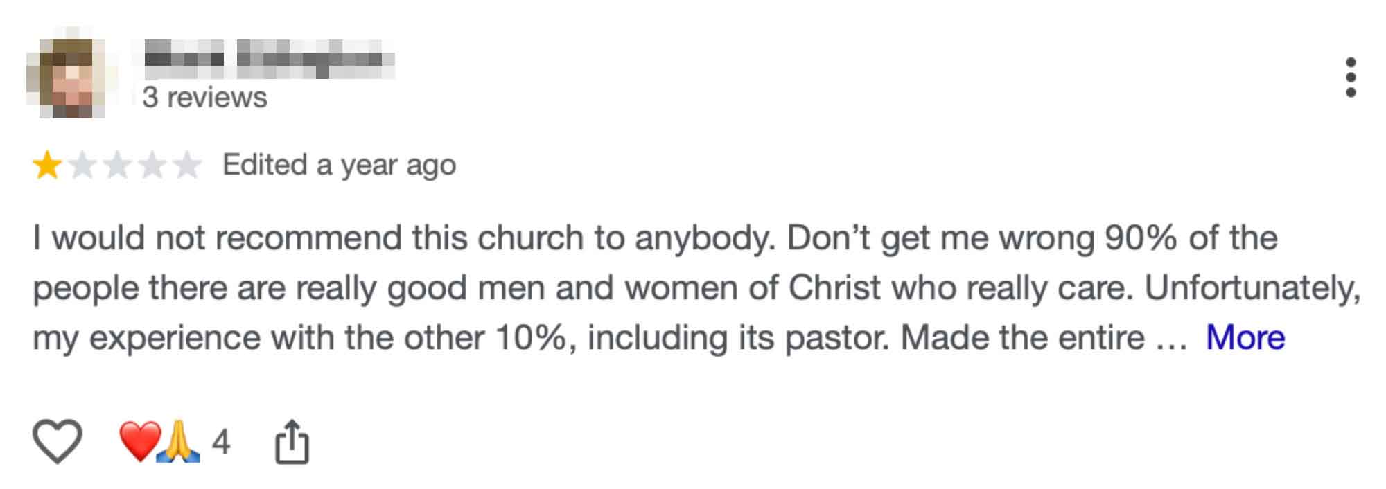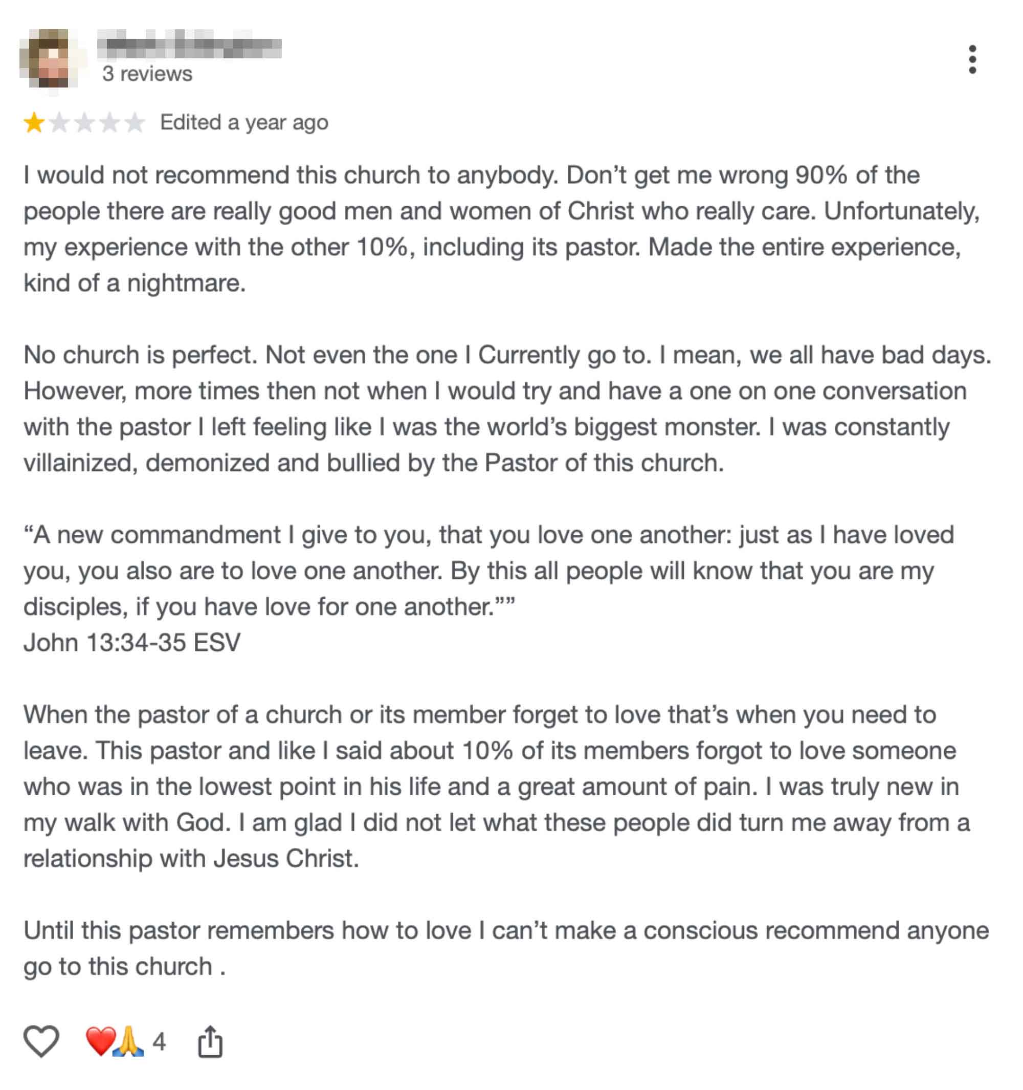 NOTE: We are not surfacing all negative reviews which have been posted to crowdsourced review sites. Rather, we have selected entries which bear witness to a pattern of the behaviors outlined in our article "8 Signs of a Dysfunctional Church".