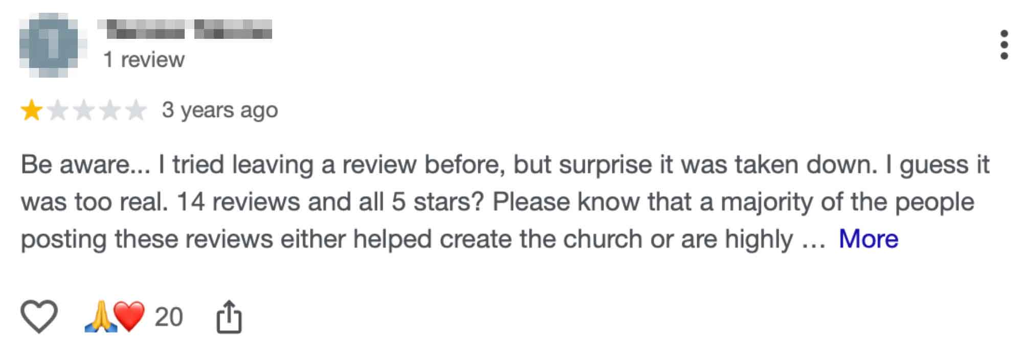 Network churches heavily control their public image, going to great lengths to control information about their methods and practices. Leaders encourage church members to flood sites like Google Reviews with positive reviews for Network Churches (and, in some cases, for churches other than the one the reviewer attends). This practice of having members leave positive reviews on social media has had the effect of burying legitimate public criticism.